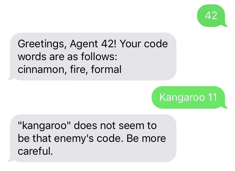 A social game for guests to play at a cocktail party. Participants use text messages to communicate with the game; they are assigned a spy identity and words to surreptitiously insert into conversation, and told to report any suspicious words said by other partygoers to gain information about their identities. Subterfuge ensues. Production notes and a transcript of one playthrough are available at http://instamatique.com/hackerschool/blog/2013/11/11/project-writeup-spy-game/ and the code is available on Github.